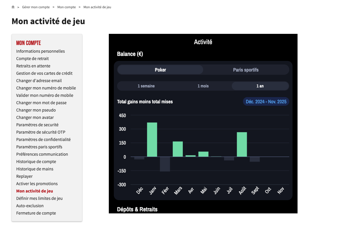 Dans cette logique, Winamax met l’accent sur la transparence et l’autonomie du joueur. Le tableau de bord “Mon activité de jeu” en est l’illustration la plus concrète : un outil accessible depuis l’espace personnel qui permet à chaque utilisateur de suivre ses dépôts, retraits, gains et pertes, mais aussi de fixer ses propres limites. Ce n’est plus un rappel imposé, c’est une main tendue.