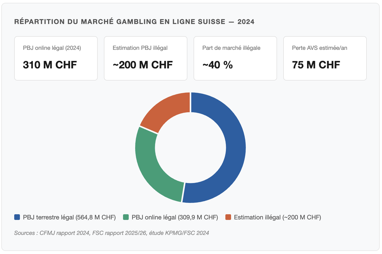 L’étude KPMG, commandée par la FSC elle-même et publiée en 2024, estime que les opérateurs non licenciés détiennent environ 40 % du marché des jeux en ligne en Suisse. Le PBJ (Produit brut des jeux, c’est-à-dire la différence entre les mises encaissées et les gains reversés aux joueurs, l’indicateur de référence du secteur) online légal atteignait 309,9 millions de francs suisses (environ 325 millions d’euros) en 2024 selon le rapport de la CFMJ. Si l’illégal représente 40 % du marché total, son PBJ se situe autour de 200 millions de francs suisses supplémentaires (environ 210 millions d’euros). C’est un marché dans le marché, aussi large que le PBJ terrestre de cinq grands casinos réunis.