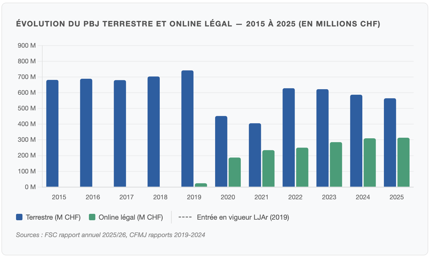 Le pic historique du PBJ terrestre suisse date de 2007 : 1 milliard de francs suisses (environ 1,05 milliard d’euros). Dix-huit ans plus tard, ce chiffre a été divisé par deux. La LJAr (Loi fédérale sur les jeux d’argent, entrée en vigueur le 1er janvier 2019, premier cadre légal unifié de la Suisse pour les jeux de hasard) n’a pas provoqué ce déclin, mais elle ne l’a pas enrayé non plus. En 2019, quand la loi est entrée en vigueur, le PBJ terrestre s’établissait encore à 742,5 millions de francs suisses (environ 780 millions d’euros). En 2025, selon le rapport annuel de la FSC, il est tombé à 564,8 millions de francs suisses (environ 593 millions d’euros). C’est une contraction de 24 % en six ans.