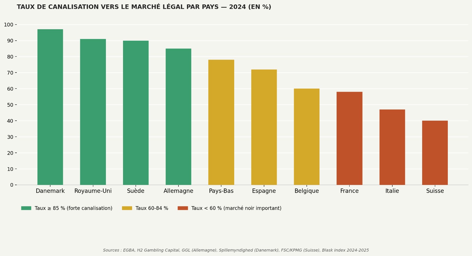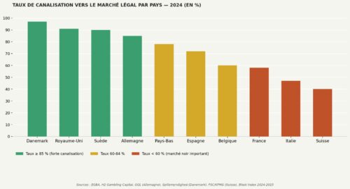 Ce chiffre n’est pas un phénomène suisse isolé. Mais il prend un relief particulier dans un pays dont l’administration est réputée pour son efficacité. En Espagne, où le marché est ouvert à la concurrence internationale, le taux de canalisation vers le marché légal dépasse 98 %. Au Danemark, il atteint 91,5 %. En Italie, il tourne autour de 90 %. En Suisse, il est estimé à environ 60 %. C’est le niveau de la Finlande avant sa réforme d’ouverture, et dans la fourchette basse de l’Allemagne selon les estimations indépendantes.